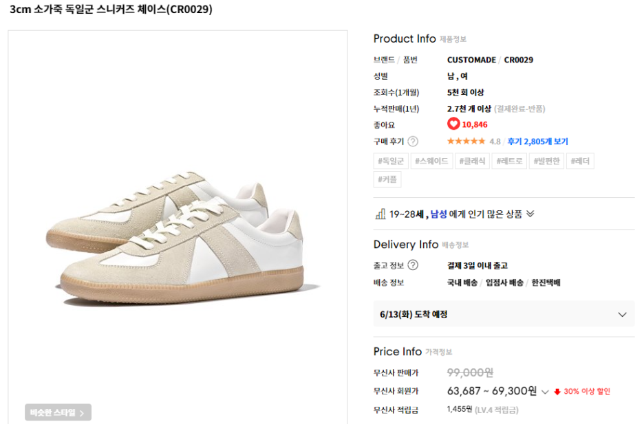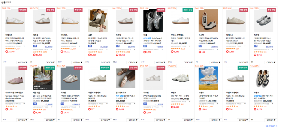 이것에 비해 무신사를 찾아보면 많은 독일군들이 있는데. 동생이 처음에 산 제품은 아디다스의 독일군이었죠. 그때 동생이 해준 말이 그렇게 비싼 제품 사는 것보다 이런 비슷한 제품 사서 막 신는 게 낫다고 하더라구요. 그때 느꼈죠. 비싼 신발 사서 아껴 신는 것보다 사서 이쁘게 막 신는 게 낫다구요.