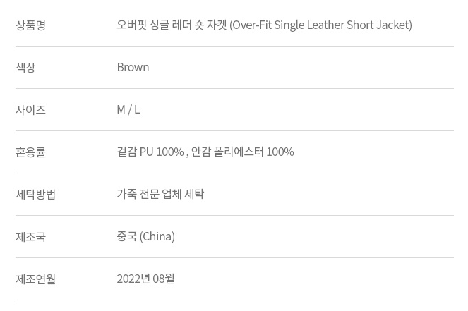 제품분류 : 아우터 > 레더/라이더스 재킷 브랜드 : 바스틱(VASTIC) 제품번호 : Over-Fit Single Leather Short Jacket_Brown 제품 : 오버핏 싱글 레더 숏 자켓_브라운 - 32,500
