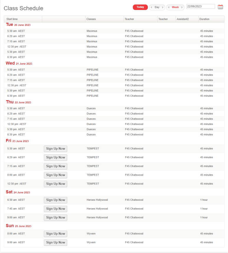시간표를 보시면 이렇게 채스우드의 경우 45분 수업이 6개씩 있는 것을 확인할 수 있습니다. 매주 클래스가 다르니 항상 확인을 하시고 가시는 걸 추천드릴게요.