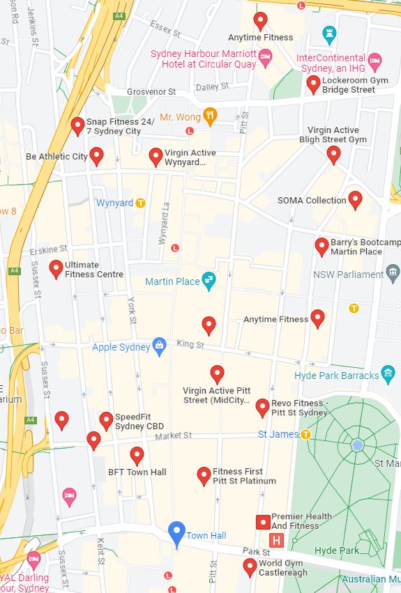 이렇게 시드니 타운홀 근처 헬스장만 검색해도 엄청 많이 나옵니다. 이것 말고도 작은 헬스장 전문 격투기 등등 운동을 할 수 있는 곳이 많습니다.